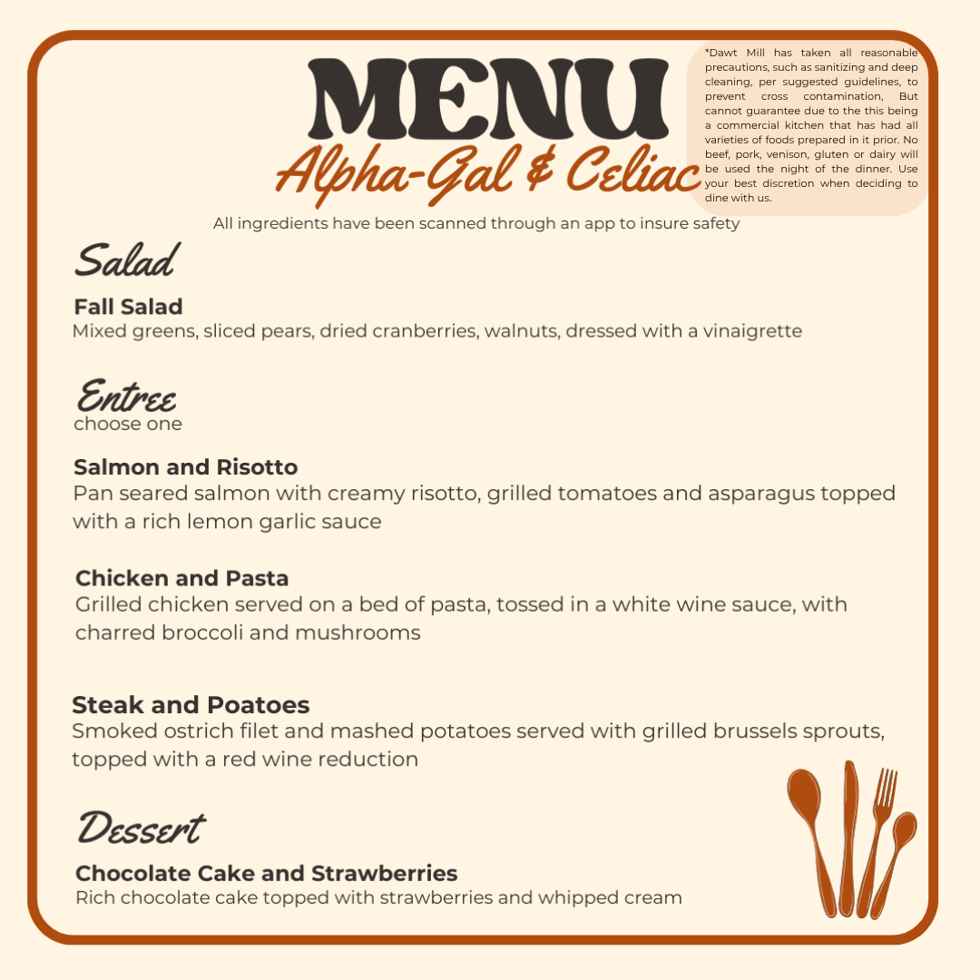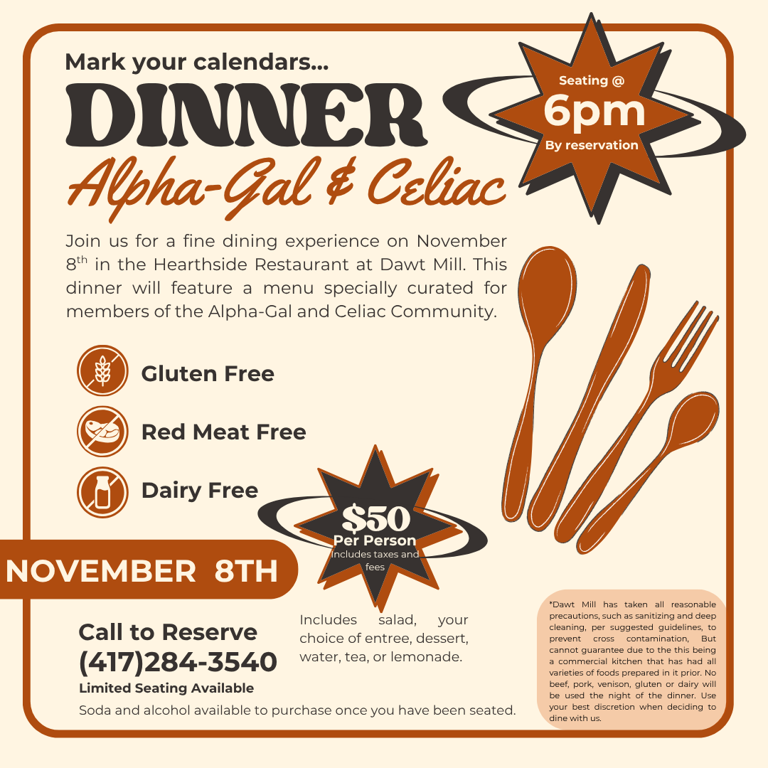 Limited seating @ 6:00pm for an Alpha Gal & Celiac friendly dinner!