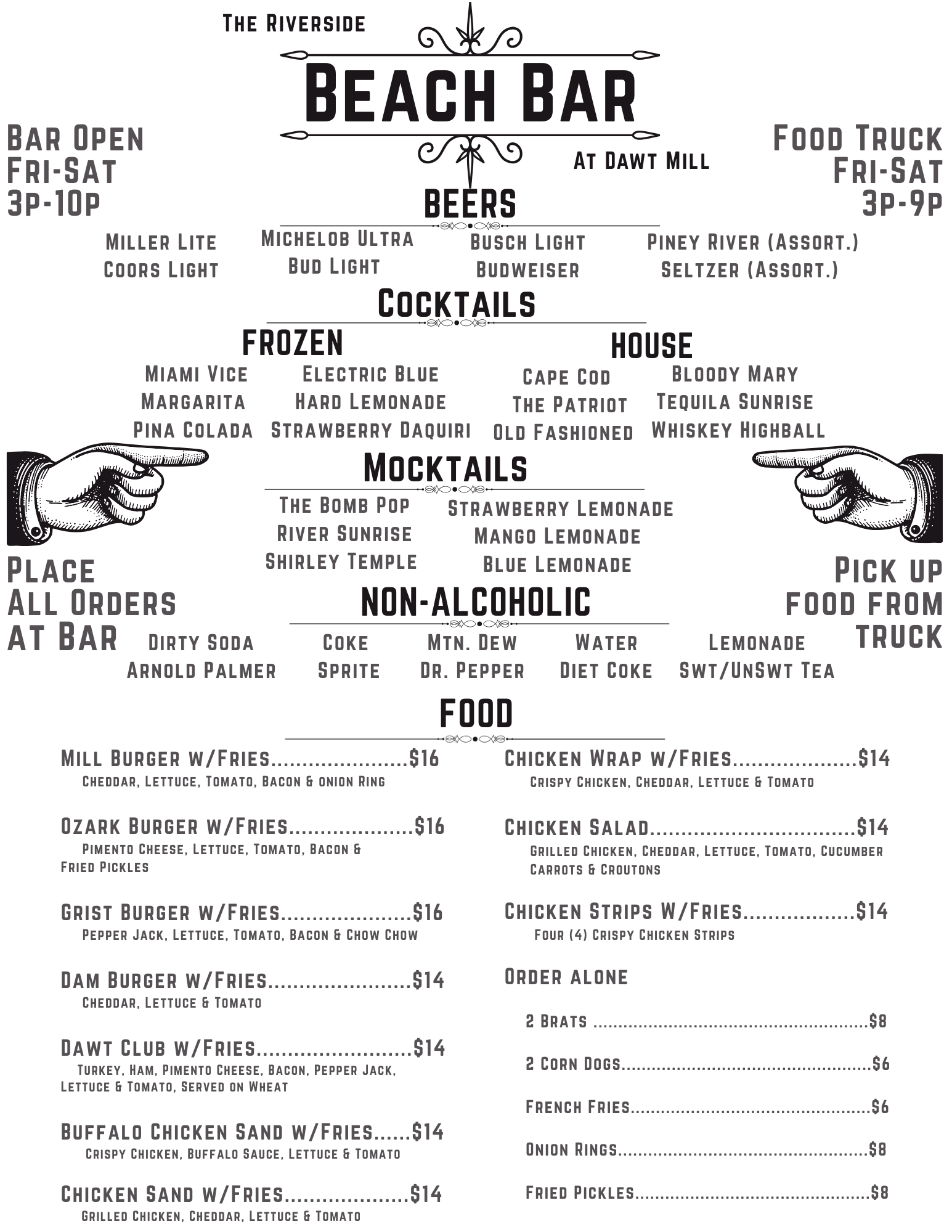 Overlooking the pristine waters of the North Fork River, the Beach Bar is a perfect setting to relax with a cold drink and grab a bite. The bar offers delicious frozen and mixed drinks, cold beer (domestic and local), and non-alcoholic options as well. Great place for the family to enjoy an evening on the river.