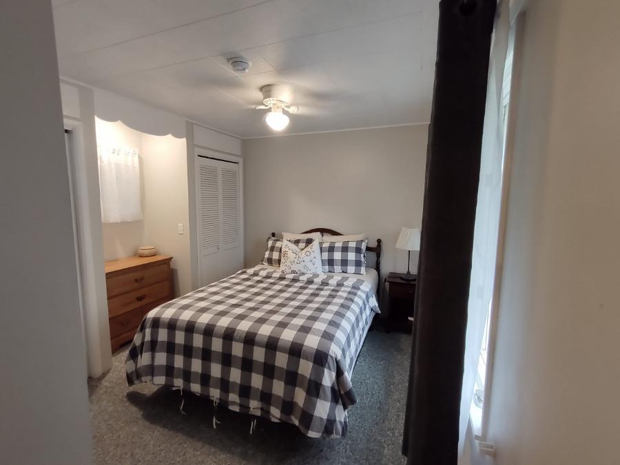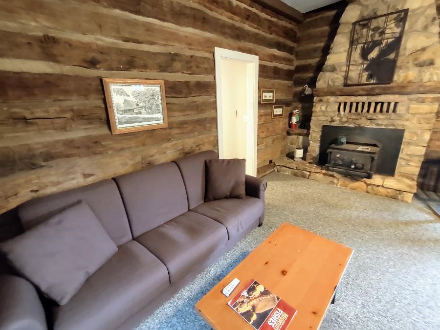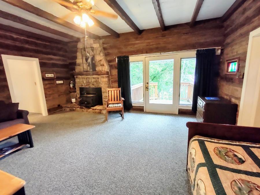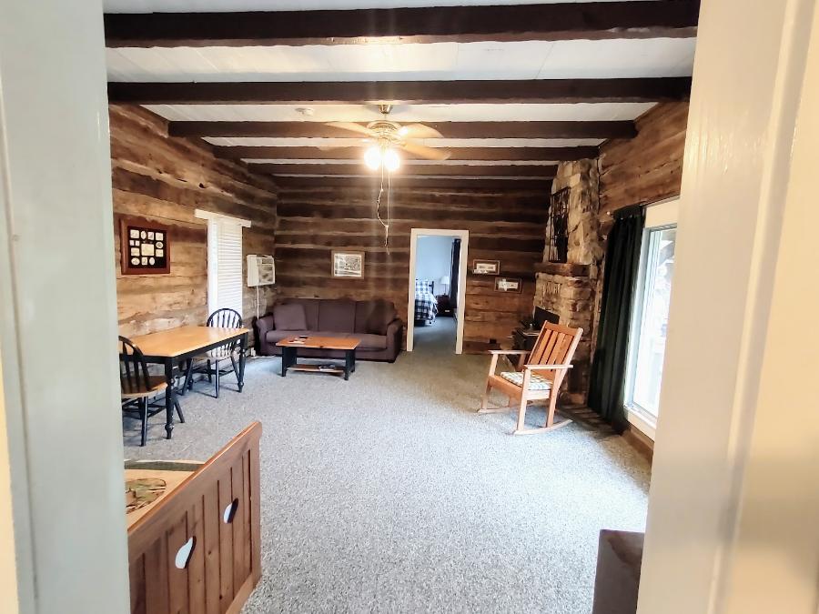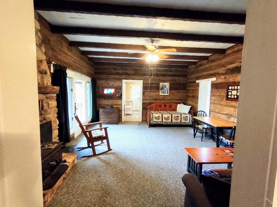 The Log Cabin sleeps four with a Queen Bed in the bedroom and a pullout sofa in the main room area . Amenities include A/C, kitchen, patio and grill area for gatherings. Kitchen includes: stove, full sized fridge, utensils, pots & pans, plates, cups, etc.